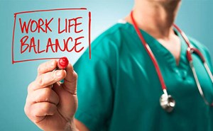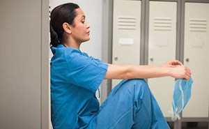 Beside her is her husband, leaning onto the gurney, holding her hand, and resting his head on her arm. She is holding her lower abdomen, with her neck flexed toward her chest and her eyes over-filled ...