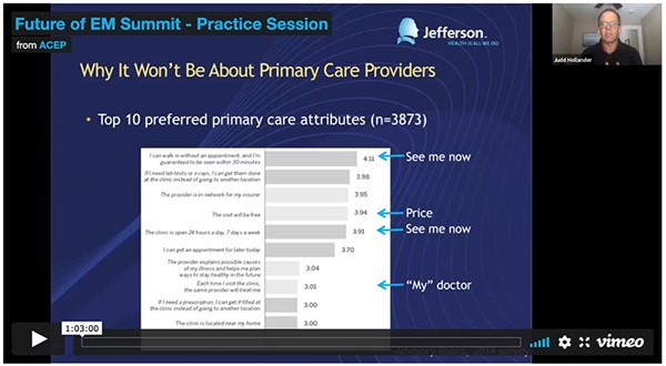 In the late summer of 2020, amid the Sars CoV 2 pandemic, then-ACEP President William P. Jaquis convened a series of summits to examine the forces that influence our practice, and the potential future changes to our specialty. A small group of thought leaders provided the initial construct of the summits, breaking them into four domains – patients, people (workforce), practice, and payment, recognizing that none of these domains are independent of the others. From that framework, four summits (virtual) were held with leaders in those domains along with a small invited audience of experts to discuss and reflect on each presentation.