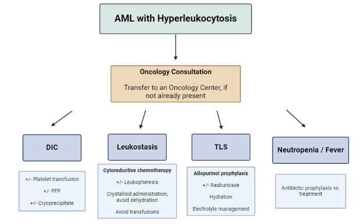 Management of leukostasis should never be undertaken without subspecialist input. If not already present, the patient should be transferred to an oncology center with expertise in managing oncologic emergencies and rapid access to genetic testing, blood products, and chemotherapeutic agents. All patients should be admitted to an intensive care unit, assuming this is concordant with their goals of care.