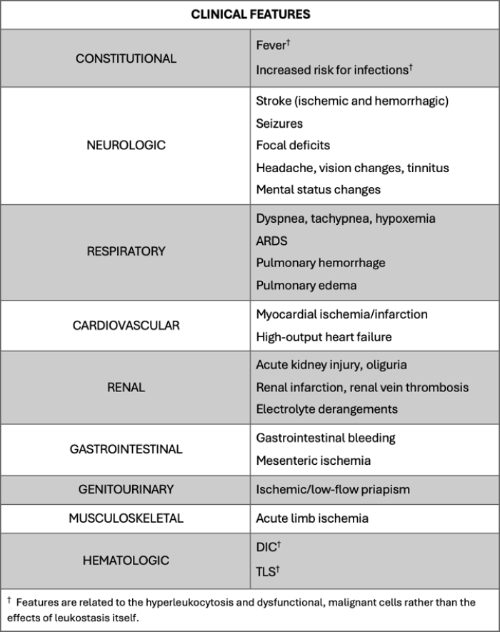 From a clinicians’ perspective, leukostasis can be perceived as a prothrombotic disorder, with symptoms resulting from widespread microvascular obstruction resulting in ischemia and bleeding. Leukostasis can involve almost any organ system; however, neurological and respiratory manifestations are the most common and serve as important diagnostic clues. Notably, the most common causes of early mortality are lethal hemorrhagic and thromboembolic events, respiratory failure, and neurologic complications.