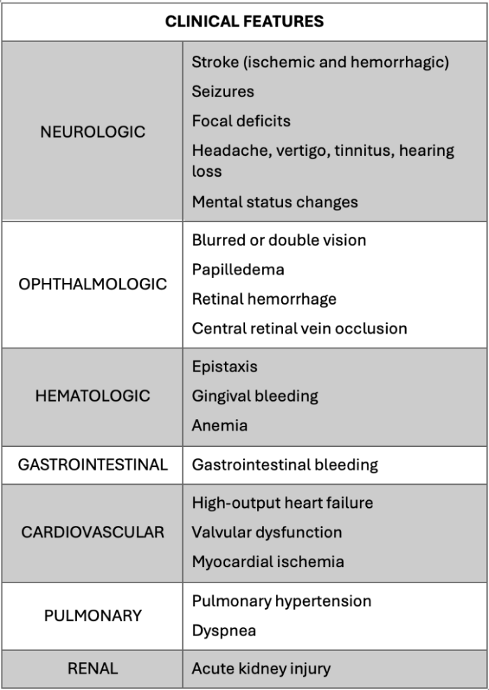 Recurrent presentations for epistaxis, particularly when bilateral and in a patient with an underlying plasma cell dyscrasia or other compatible symptoms, should raise suspicion for this diagnosis. - Neurologic manifestations are often the most prominent feature of HVS and occur due to decreased cerebral blood flow. Symptoms vary in severity and can include headaches, vertigo, tinnitus, mental status changes, seizures, and stroke.
