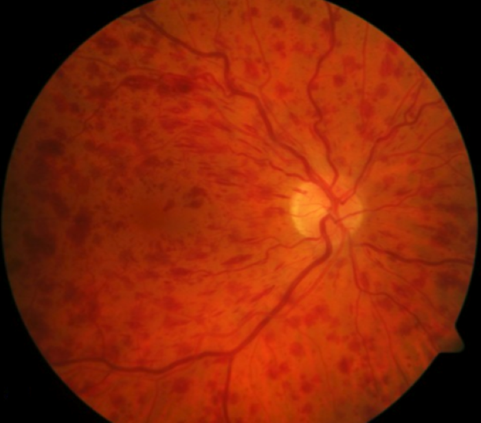 Retinal venous engorgement, retinal hemorrhages, and venous tortuosity in a patient with central retinal vein occlusion