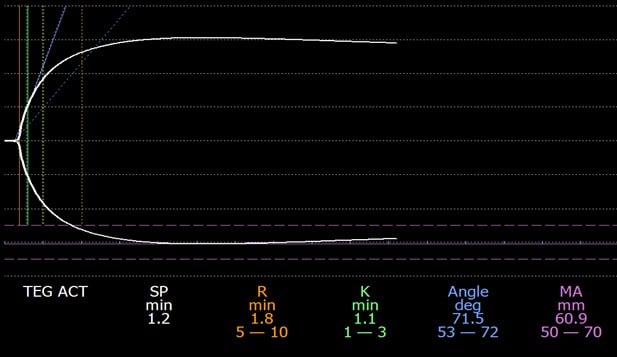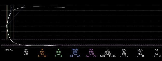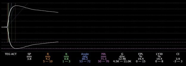 With the presentation of the novel SARS-CoV-2 and subsequent clinical condition of COVID19, hypercoagulable states are under further scrutiny and consideration. Evidence of deep vein thrombosis and pulmonary embolism are being increasingly described as part of the COVID19 syndrome, which brings about the question, what does hypercoagulable state look like on TEG? In Figure 1, a general demonstration of hypercoagulopathy secondary to infection is seen. Notably, there is a short R time, a hyper acute angle, a high MA, and low LY30; all of which corresponds to rapid factor activation, rapid fibrin plug formation and platelet aggregation, and limited clot degradation. Often, in the presence of these findings in addition to clinical findings of thrombosis, full dose anticoagulation is warranted.