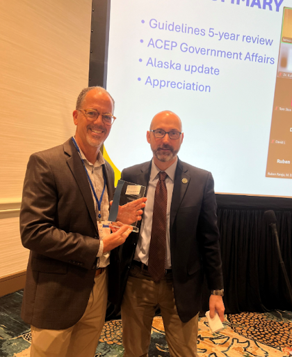 Dr. Joseph Scott receiving the award from JT Finnell, MD, FACEP, at ACEP24