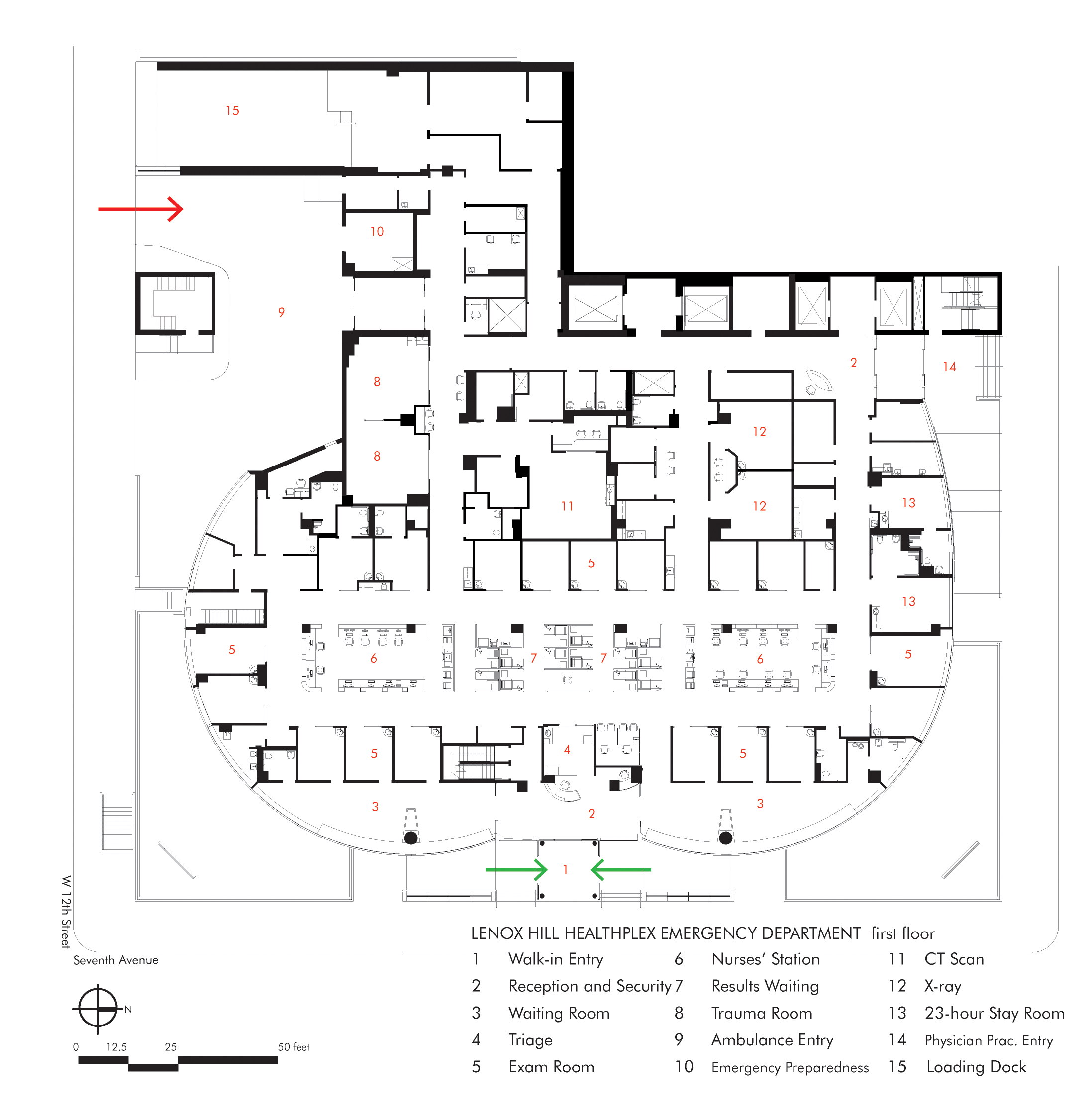 Floor plan indicating ambulance (red) and walk-in (green) entries, Lenox Health Greenwich Village, Freestanding Emergency Department.