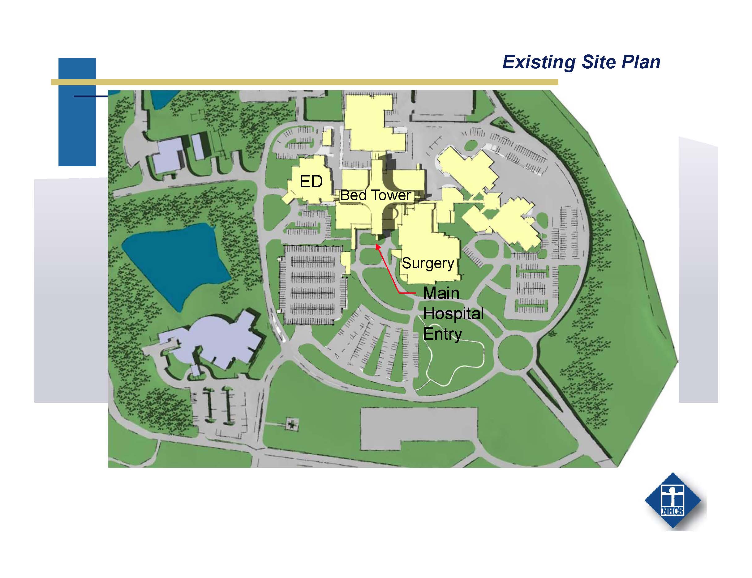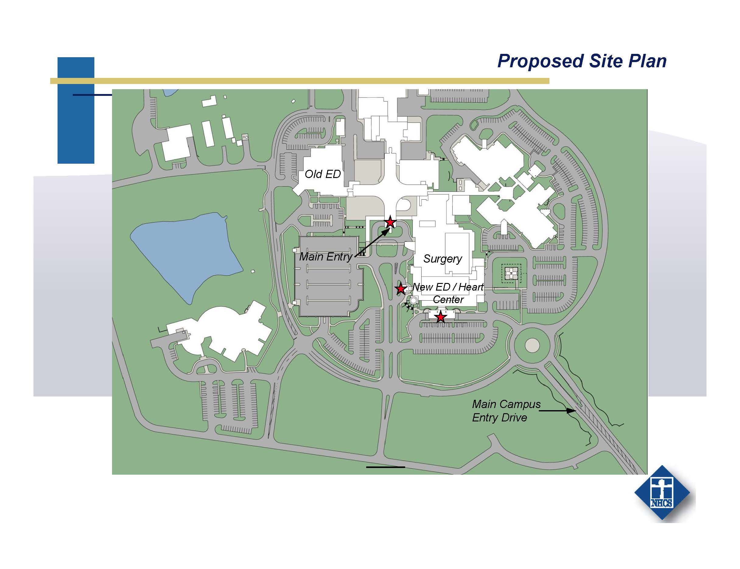 As one of the busiest emergency departments (ED) in North Carolina, the existing ED at Nash General Hospital faced multiple challenges because of its age, proximity to other compatible departments, and its visibility to visitors. Constructed in the 1980s, the facility had undergone multiple renovations in an attempt to accommodate increasing patient volumes but lacked a comprehensive patient experience. The structure was located at the rear of the campus and landlocked between a large retention pond, the existing hospital bed tower, and an existing parking deck. These site challenges not only made it difficult for visitors to find and access this critical service line but also secluded the ED’s access to other compatible departments often necessary with an emergency visit. (See Existing Site Plan)