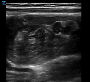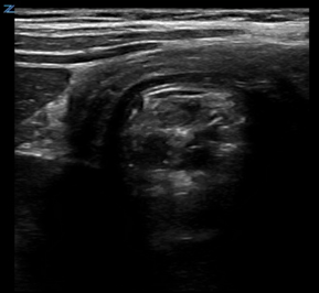 Classically, intussusception manifests in the transverse orientation as a ‘target sign’ or ‘donut sign’ (Figure 1) representing layers of intestine within the intestine. In the longitudinal orientation, the layers of intestine appear as a ‘pitchfork’ or ‘submarine sandwich’ (Figure 2). These findings are most commonly seen in the right lower quadrant for ileocolic intussusception, which is the most common type of intussusception. Small bowel intussusceptions can be differentiated by their size, which are often ≤3 cm.5 While small bowel intussusceptions often spontaneously reduce, if symptoms and findings persist, computed tomography (CT) may be necessary to determine management. POCUS is useful in differentiating variants of intussusception that range from a surgical emergency to a transient source of abdominal pain allowing clinicians to better manage these patients.6