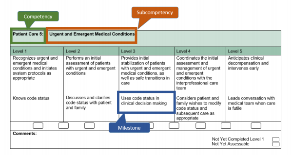The original milestones subdivided the six core competencies into a total of 23 subcompetencies. Within each subcompetency, developmental progression is described as specific milestones subdivided by numbered levels from 1 to 5 (Figure 1). Consistent with the principles of competency-based medical education, these levels do not correspond to the number of years of graduate medical education but rather a progression through residency with the expectation that some residents may progress quicker than others through the milestones. A Level 1 milestone is that expected of an incoming resident, a level 4 is an expected target of graduating residents, and a level 5 is expected of those several years into independent practice. Level 5 milestones are not expected of the average resident but can be seen in a few exceptional residents.