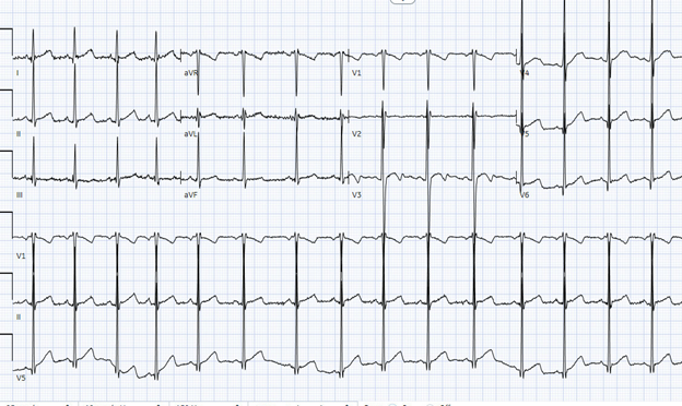 Initial workup showed an electrocardiogram (Figure 1) with left ventricular hypertrophy (LVH) and Q waves in the lateral leads.
