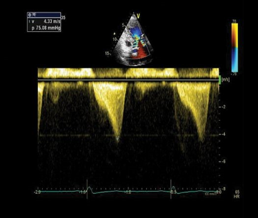 Figure 4. Apical 5-chamber view using continuous wave Doppler displaying a “dagger-like” left ventricular outflow obstruction with a maximal peak gradient of 75 mmHg.1