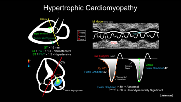 ACEP’s critical care ultrasound subcommittee has been working on advanced cardiac ultrasound educational cards to share with the community as a reference when performing critical care bedside ultrasound. Figure 5 is a graphical representation of HCM and the pathologic measurements. It is a useful tool when discussing a case with your consultants. Stay tuned for more to come from the group!
