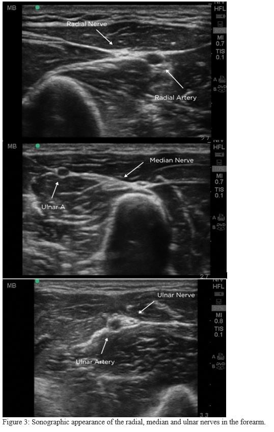 Difficulty clearly identifying nerves amongst the other structures is a common frustration. In cross-section on US, a nerve appears as an elliptical bundle containing many small scattered echogenic foci and running within a fascial plane. These blocks are best performed in the mid-forearm. The distal forearm has many tendons which may be mistaken for nerves and in the proximal forearm the nerves are deeper making them more difficult to target.
