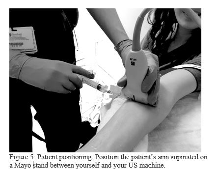 Spend sufficient time setting up for the procedure. If you and your patient are comfortable, you are more likely to perform a safe and successful block. Rest the patient’s arm on a mayo stand for greater stability. Position the ultrasound machine in front of you, don’t look sideways or backwards over your shoulder. The patient’s arm will be between you and your US machine.
