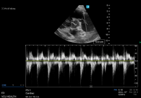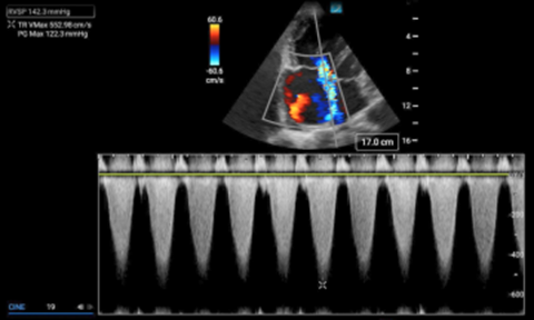 The right ventricular systolic pressure (RVSP) determined by echocardiography can approximate the pulmonary artery systolic pressure (assuming a normal pulmonic valve). Determining this value is predicated on the ability to measure the velocity of the tricuspid regurgitant jet in an apical four chamber view. To obtain this value, the tricuspid regurgitant jet is first identified in an apical four chamber view (A4C) using color doppler. The eccentric jet shown in Figure 1 highlights the importance of first localizing it with color doppler. Then a continuous wave (CW) doppler line is placed through that jet with the focal zone (diamond) in or near the vena contracta (the thinnest part of the jet close to the valve). The resulting wave form should demonstrate repeating downward parabolas. (Figure 1) Increasing the doppler scale, and adjusting the baseline upwards, may be necessary to avoid aliasing for these high velocity cases. The pressure gradient is then extrapolated by using a simplified Bernoulli equation. In the case of this patient, the velocity measures 5.53 m/s, so the pressure gradient (PG) is about 122mmHg (normal would be zero to trace regurgitation). In cases where the diagnosis of PAH is known, comparing the patient’s historic RVSP value to that on presentation, can be helpful.