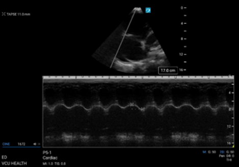 Figure 5. M-mode tracing demonstrating an abnormally low TAPSE measurement.