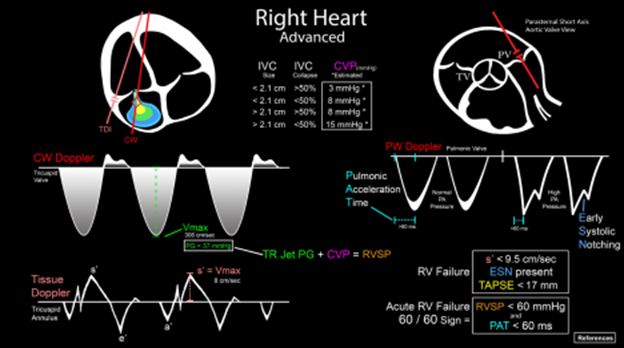Point-of-care echo continues to be an invaluable tool in evaluating critically ill patients with complaints of chest pain or dyspnea, where the differential can be broad. The advanced right heart measurements reviewed here can be utilized in those cases where RV enlargement and dysfunction is suspected, both to distinguish the acuity and severity of the disease process.