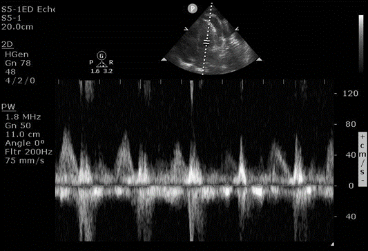 An apical four chamber view was obtained, and a pulsed wave Doppler was placed in the left ventricle, and an E and A wave were generated over the patient’s respiratory cycle. (Figure 2) This showed a > 30% variation in the E wave, suggesting sonographic pulsus paradoxus.