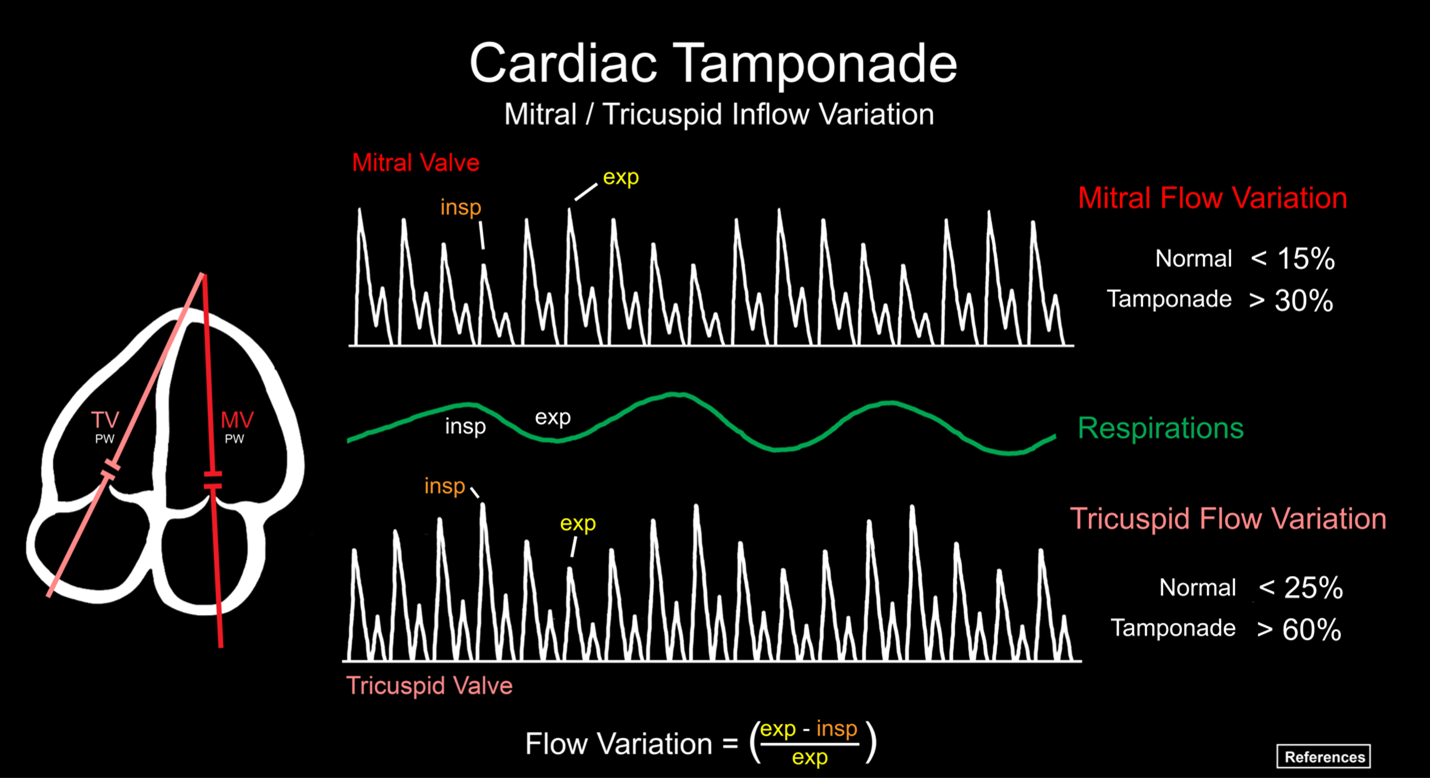 Looking at respiratory variation in blood flow through the mitral valve is often thought of as difficult to acquire but can be performed reliably after practice. A good apical four chamber view is a necessity, and the pulsed wave Doppler gate is placed within the left ventricle at the coaptation of the mitral valve leaflets, generating an E wave first (early diastole) and an A wave second (atrial kick). The ED physician should ask the patient to take a breath, and an E and A wave are generated throughout the respiratory cycle. The image is frozen, and the amplitude of the largest and smallest E wave is measured. Figure 2 If the difference is greater than 30%, this finding is very specific for cardiac tamponade. While this same approach can be performed using the tricuspid valve, the right ventricle can be more difficult to obtain a clear view of, and the difference in E wave amplitude must be greater than 60% to be considered positive. While other sources say the mitral valve needs greater that 25% variation, and the tricuspid valve needs greater than 40% variation for tamponade, using 30% and 60% respectively will increase specificity.