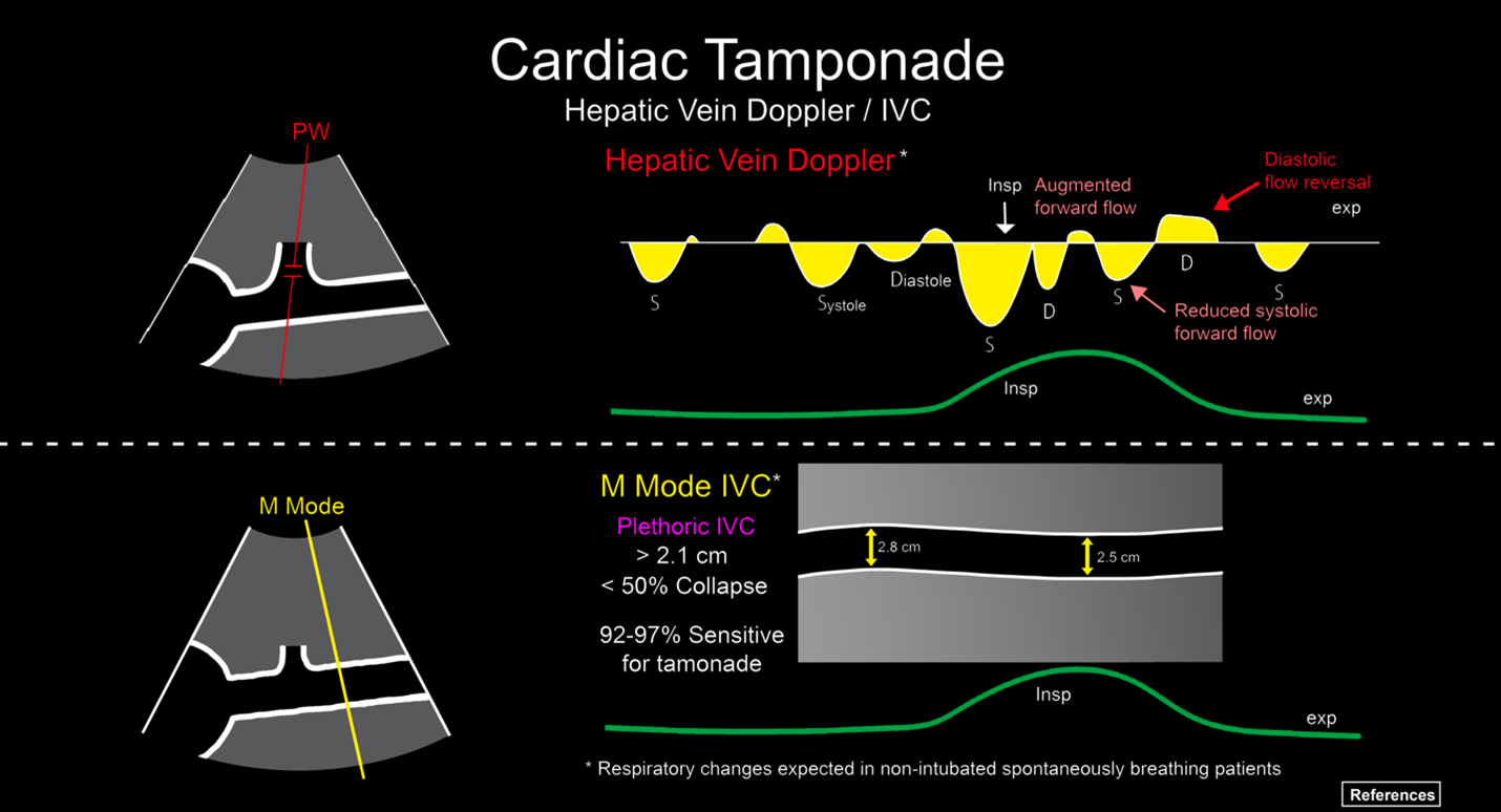 The use of the IVC helps assess for risk of cardiac tamponade, as a plethoric IVC is the most sensitive sign of cardiac tamponade. While a patient can have a normal or flat IVC in the setting of tamponade, it requires a low blood volume due to hemorrhage or massive gastrointestinal losses and is exceedingly rare.