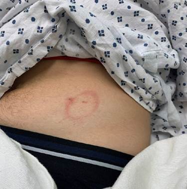 A 14-year-old male suffers a handlebar injury to the lower left abdomen after a fall from a bicycle. His vital signs are normal. On physical exam, there is a circular imprint in the left lower quadrant (Figure 1). His abdomen is soft with mild tenderness to palpation. On FAST examination, there is free fluid in the pelvis. Additional images over the area of impact reveal an abdominal wall defect with signs of a traumatic bowel hernia (Video 6). The intestine can be seen crossing the fascial plane into the soft tissue. A CT scan confirms the disruption of the abdominal musculature fascia in the left lower quadrant. The patient requires laparoscopy to identify and repair the defect (Figure 2)