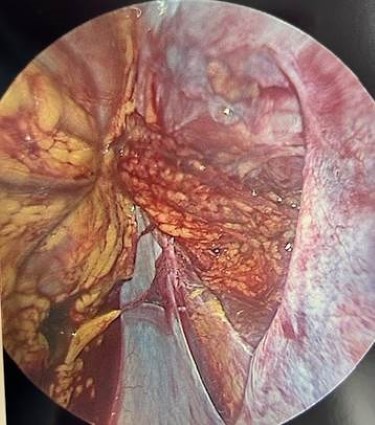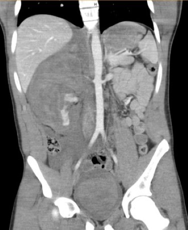 A 16-year-old male presents with acute hematuria and abdominal pain after being checked with a lacrosse stick during practice. He is hemodynamically stable with a heart rate of 58. A FAST exam is performed by the treating clinician within 15 minutes of arrival to the pediatric emergency department. On FAST examination, there is free fluid in the right upper quadrant, and a mass is visible at the edge of the liver where the kidney is expected to be seen (Video 7). On the suprapubic view, the bladder contains a large echogenic clot (Video 8). Immediate surgical consultation and a CT scan confirm the presence of a large retroperitoneal hematoma with extravasation (Figure 3). The patient requires urgent operative intervention and nephrectomy.