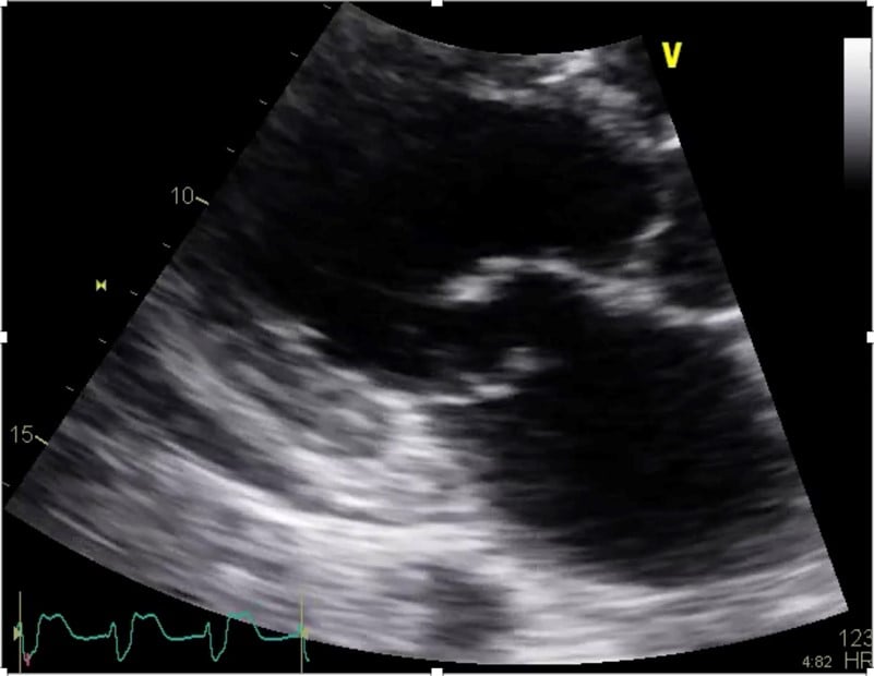 A point-of-care ultrasound was performed to help differentiate the cause of hypoxia and hypotension. The findings were consistent with the sequela of the patients recent RCA occlusion which demonstrated a newly identified flail posterior mitral valve leaflet and severe mitral regurgitation (Figures 1, 2, and 3). Subsequently, the patient was taken emergently to the cath lab for placement of an intra-aortic balloon pump (IABP). The balloon pump was adjusted to maximize the diastolic augmentation and minimize pre-systolic LV afterload to optimize the patient’s cardiac function.1 Once he was stabilized, the patient was taken to the operating room for a mitral valve replacement. After a prolonged hospital course, the patient survived to discharge and was sent to a skilled nursing facility for cardiac rehabilitation.