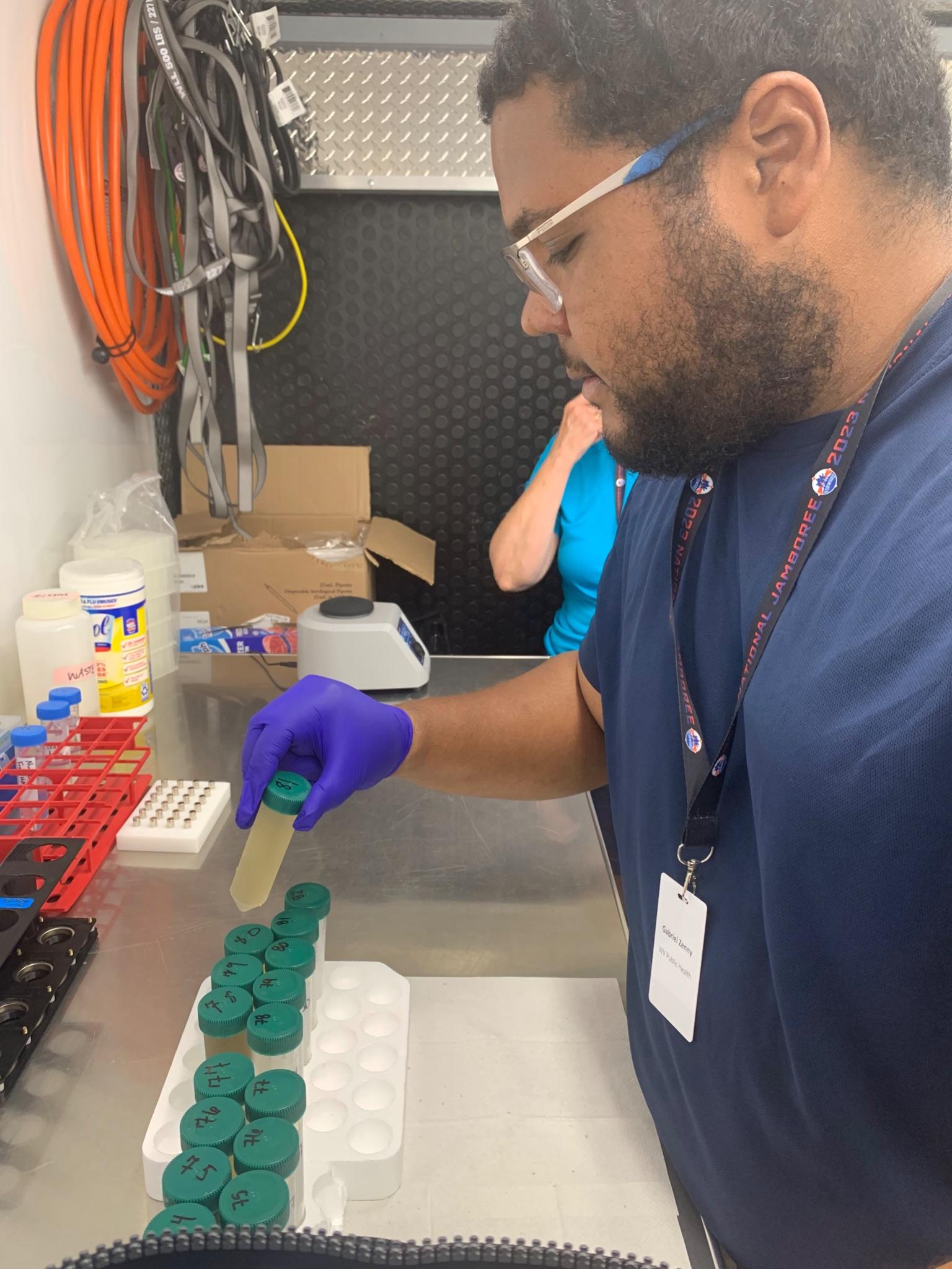 Gabriel Jamill Zenny organizing samples and preparing them for processing during the 2023 World Scout Jamboree