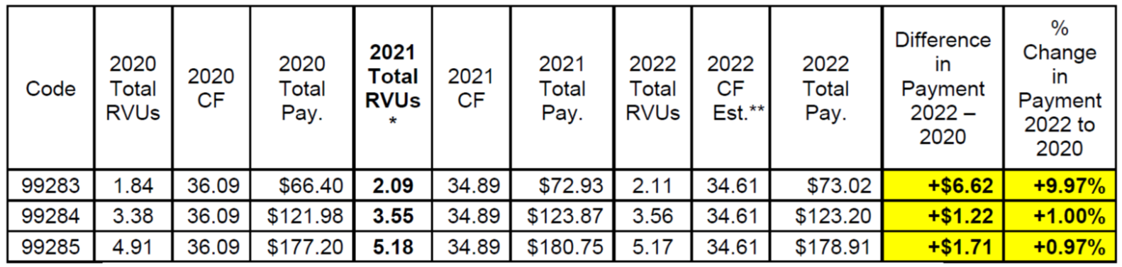 And what does this mean for your reimbursement as an emergency physician? Well, unfortunately, the 2 percent sequester is not going to go away. In fact, Congress paid for the fix in part by increasing the sequester percentage in 2030 (i.e., kicking that particular can even further down the road). HOWEVER, notwithstanding the sequester (which is really beyond our control), your PFS payments may still be higher than they were in 2020 because of ACEP's previous advocacy work! As you can see from the chart below, you may be better off in 2022 compared to 2020 as a direct result of the increases to the ED E/M levels 3-5 relative value units (RVUs) that ACEP pushed for in 2021. In other words, although the PFS conversion factor has declined in both 2021 and 2022, the RVU increases ACEP secured for the main codes that you bill for have practically made up for these decreases.