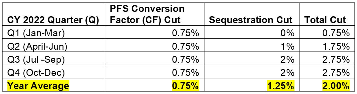 - PFS Conversion Factor Cuts: The Act provides a one-year increase in the conversion factor of 3.0 percent. Note that this does not fully cancel out the scheduled 3.75 percent reduction, and ultimately leaves us with a 0.75 percent cut in the PFS conversion factor for CY 2022.