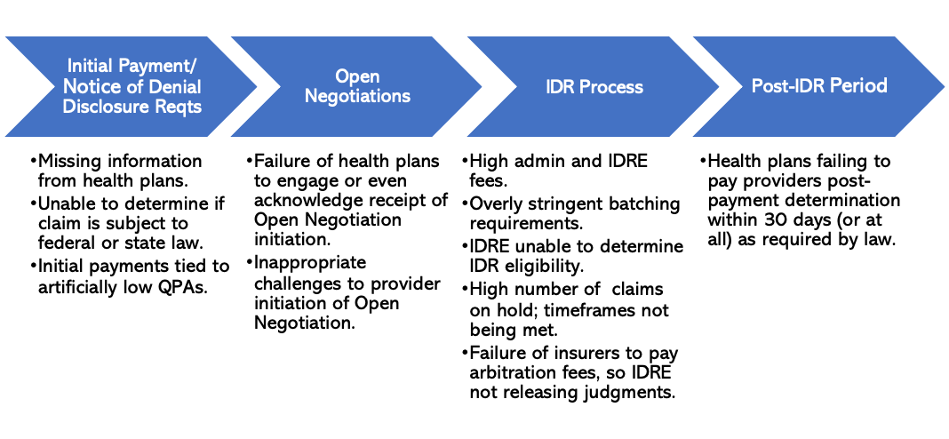 Further, we wanted to provide additional, specific recommendations on how each phase of the dispute resolution process can be improved. Unfortunately, as reflected in the table below, there are issues at every step along the way, from the time physicians receive the initial payment or notice of denial for an out-of-network service, to the Open Negotiations and independent dispute resolution (IDR) processes, and ultimately to the post-IDR period. Throughout each step of the process, there is a perceived lack of enforcement of all the statutory or regulatory requirements, thereby allowing these issues to remain ongoing and unchecked, with little recourse to the party that is not complying with the requirements.