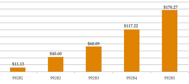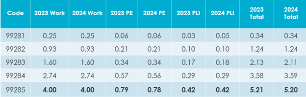 CMS did not make changes to the Work RVUs for the ED E/M codes, but there were a few small changes to the Practice Expense and Professional Liability Insurance RVUs at the hundredth decimal place.