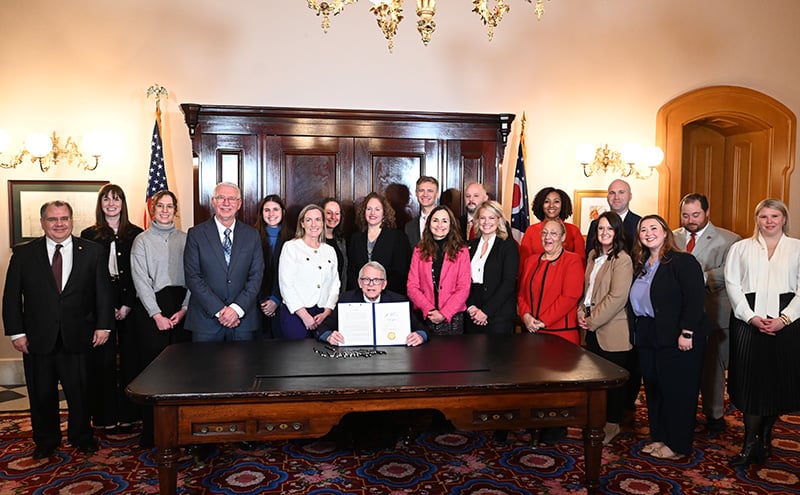 Ohio ACEP's Government Affairs Chair, Dr. RJ Sontag, Workplace Violence Workgroup Chair, Dr. Nicole Veitinger, Executive Director Holly Dorr, and lobbyist Amanda Sines attend Governor DeWine’s signing ceremony for H.B. 452, the Healthcare Workplace Safety Bill.