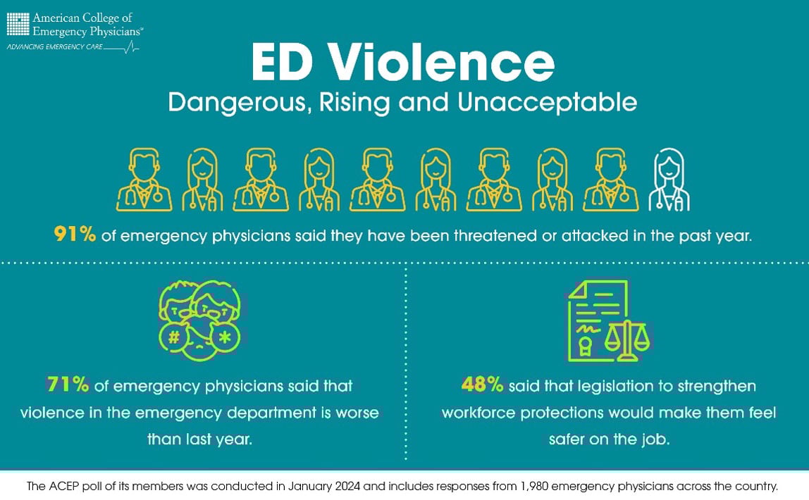 They cited data from a 2024 ACEP member poll to emphasize that physical and verbal assaults are common across the country.