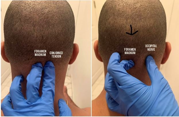 - Identify the foramen magnum, the conjoined tendon, and the occipital nerve groove of the skull just lateral to the tendon with your hand.