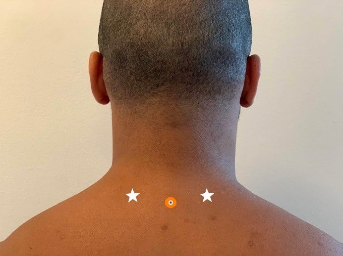 - Inject 1.5 cc (per injection site) into the paraspinous muscles bilateral to the C6 or C7 spinous process (2-3 cm from the spinous process).