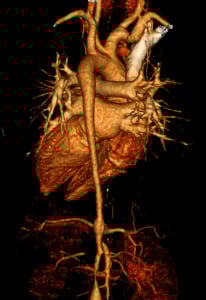 Patient was seen at her primary care office who advised she present to the ER for an elevated blood pressure of 180/100. Upon arrival to the ER, her blood pressure was re-checked 3 times, revealing pressures of 195/99, 199/95, and 222/100. She then had blood pressure taken in all 4 extremities, which revealed a right arm pressure of 191/101 and a left arm pressure of 189/95. However her right leg pressure was 139/70 and left leg pressure was 131/90, significantly lower. Her physical exam was notable for bounding radial pulses (2+), yet very faint, barely palpable dorsalis pedis pulses.