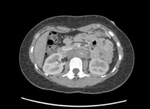 A 17-year-old female with no past medical history presented to the emergency department for 3 weeks of claudication. A week prior to her symptom onset, patient describes a brief illness that included abdominal pain, nausea, vomiting, fever, headaches, and fatigue. She was seen at an urgent care at the time and prescribed a Zpack. She was told her blood pressure was abnormally high, but could not recall the numbers, and the doctor advised it was likely anxiety. A few days after, she was feeling better, but began to have pain in her legs when walking. She did not have any pain at rest. She reports the pain in her legs worsened over the next few weeks, where she became unable to walk across a room without severe pain in her lower legs. The pain started in her calves and extended up to her thighs and even up to her abdomen. She described numbness and tingling in her lower extremities as well, and that her legs felt “cooler” to her. She denied any known trauma to her legs or back.