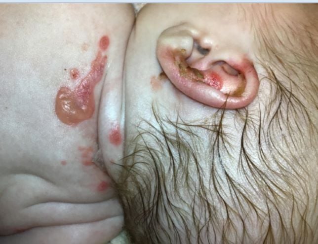 After proper vital sign measurement, wound care, IV placement and fluid administration, our patient was started on IV Cefazolin due to concern for cellulitis and was transitioned to the pediatric intensive care unit (PICU). Further recommendation by dermatology included application of gentamicin 0.5% ointment BID. While laminin 332 is mutated in JEB due to a premature stop codon, gentamicin is known to allow read through of this premature stop codon and allow for partial restoration of the normal protein product, which may assist in wound healing.3