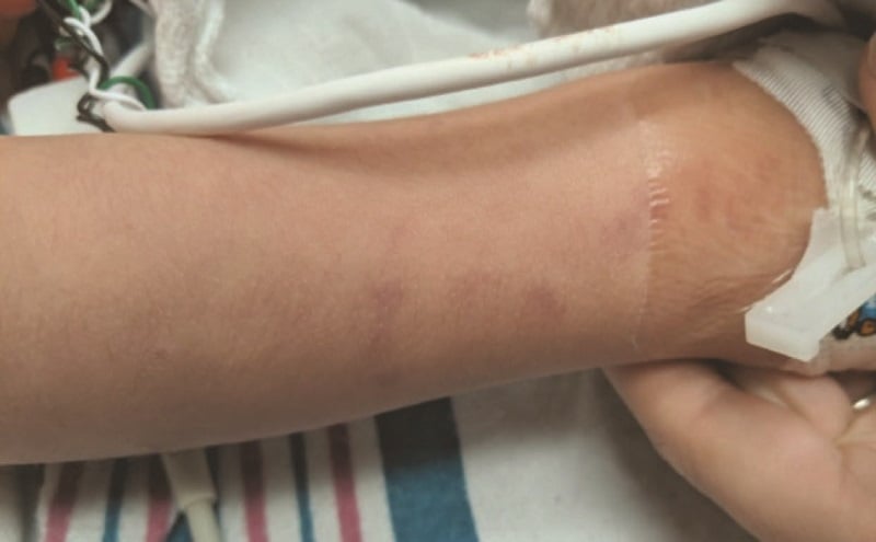 The patient was a 2-year-old female who presented to the pediatric emergency department via emergency medical services (EMS) in December due to respiratory distress, a “blue appearance,” and altered mental status. On arrival in the emergency department (ED), the patient appeared lethargic and tachypneic with peri-oral and peripheral cyanosis and she was brought immediately to a room for evaluation and placed on a monitor with intravenous (IV) access established. Initial vitals included a heart rate of 160, blood pressure of 94/50 and respiratory rate of 31. There was difficulty obtaining a pulse oximetry reading and the patient was placed on 15L oxymask due to concern of hypoxemia with subsequent O2 readings in the low 90s. The rectal temperature was 38.4°C. Our initial concern was focused on cardiopulmonary pathology; however, the lungs were clear to auscultation and a chest x-ray did not show pneumonia or cardiomegaly. A more detailed physical examination after initial stabilization revealed bilateral tympanostomy tubes and serous drainage and debris in the left ear canal, which parents stated was chronic. A very mild rash was noted on the distal right upper extremity. Upon removal of her diaper, scattered purpura was visible. She also had palatal petechiae. Within hours, her rash rapidly progressed, and she eventually developed purpura fulminans.