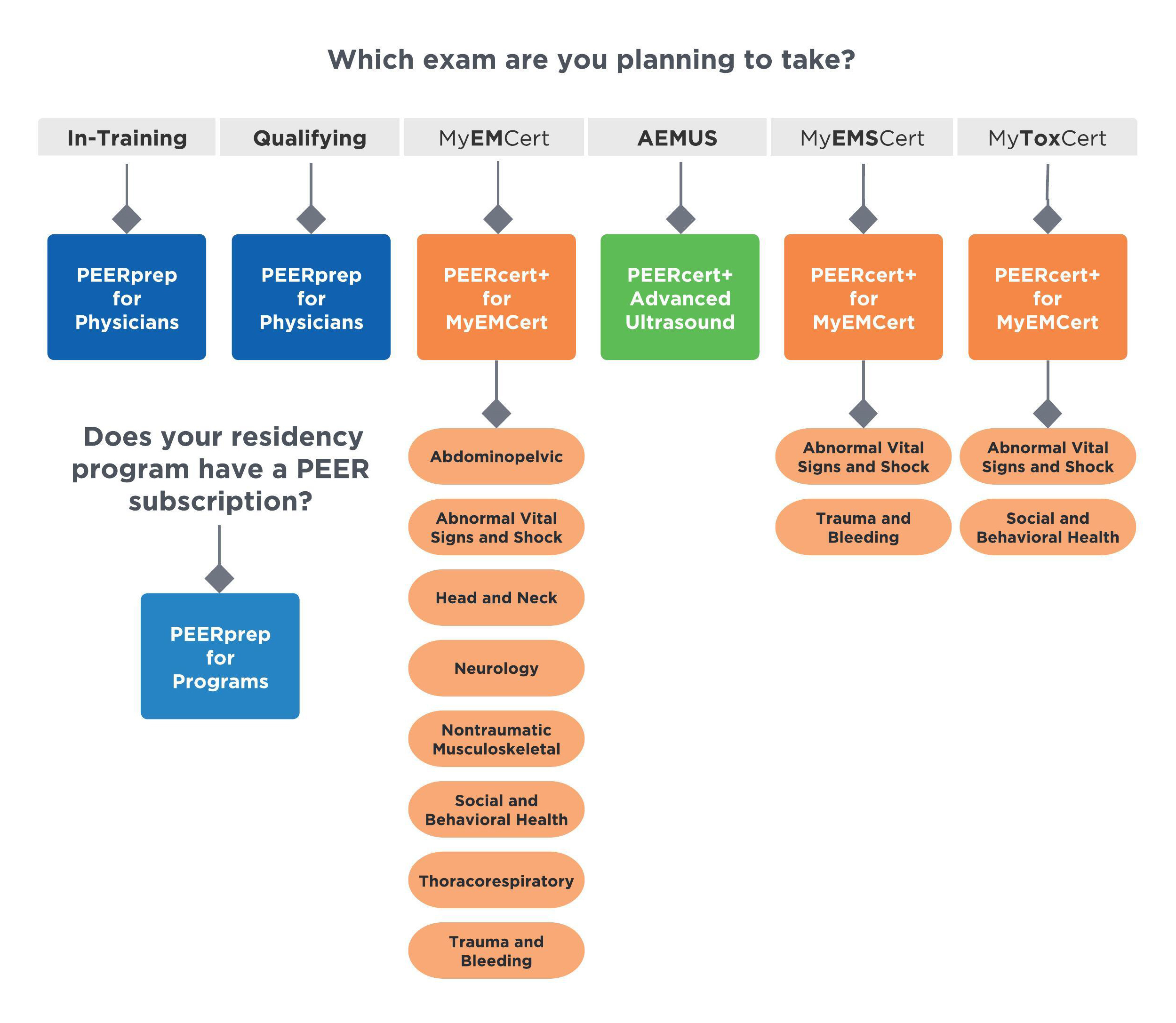 For PEERprep for Physicians, PEERcert+ for MyEMCert, PEERcert+ Advanced Ultrasound, PEERprep Mock EM Clerkship Exam With Review, or PEERprep Mock EM Qualifying Exam With Review: