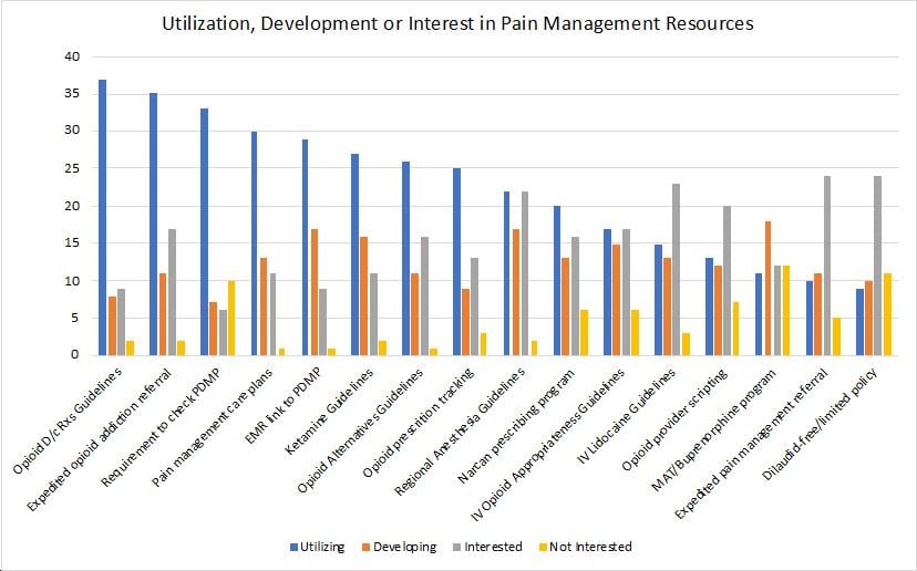 These survey results are informative towards better understanding the current state of pain management approaches nationally. Of those surveyed, there are definite trends toward not only widespread work in many different pain management approaches, but also potential receptiveness to further resource development. Some controversial areas were also evident. While much more work to be one, these results are encouraging and demonstrate the efforts of many towards this important issue.