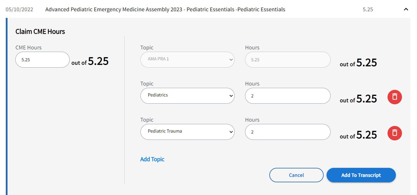 - On the next screen, find the Advanced Pediatric EM Assembly, expand using the down arrow on the right, and enter the number of hours you wish to claim. You can also enter the number of hours broken down by topic.