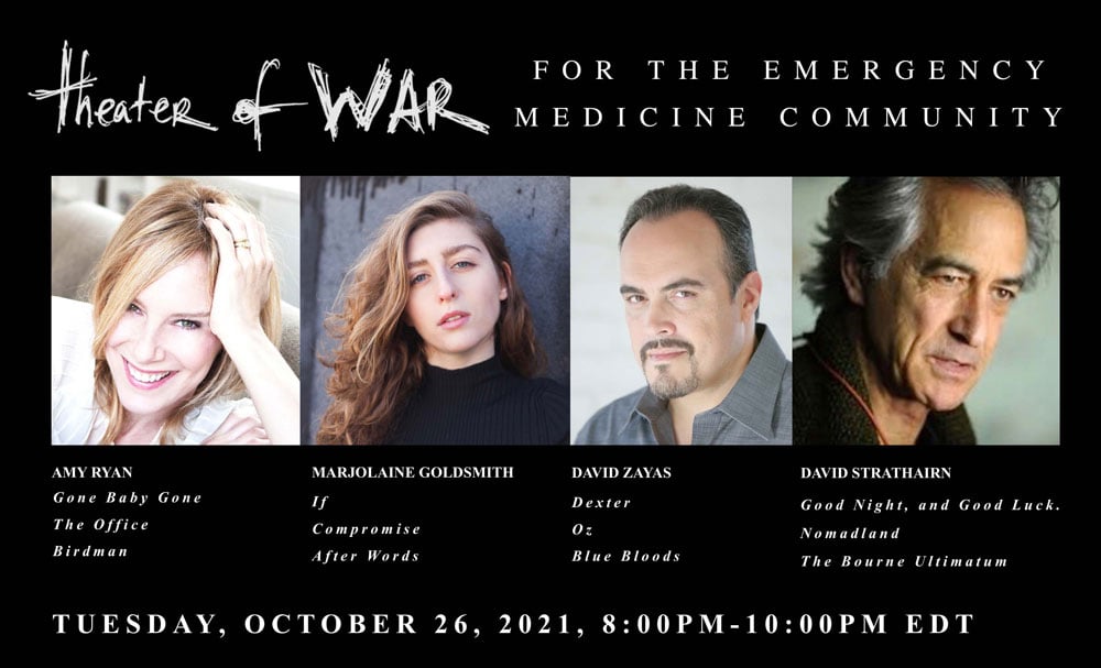 Theater of War for the Emergency Medicine Community is an innovative project that presents dramatic readings by acclaimed actors of scenes from ancient Greek plays to help emergency physicians and other healthcare professionals engage in healing, constructive discussions about the unique challenges and stressors of the COVID-19 pandemic.