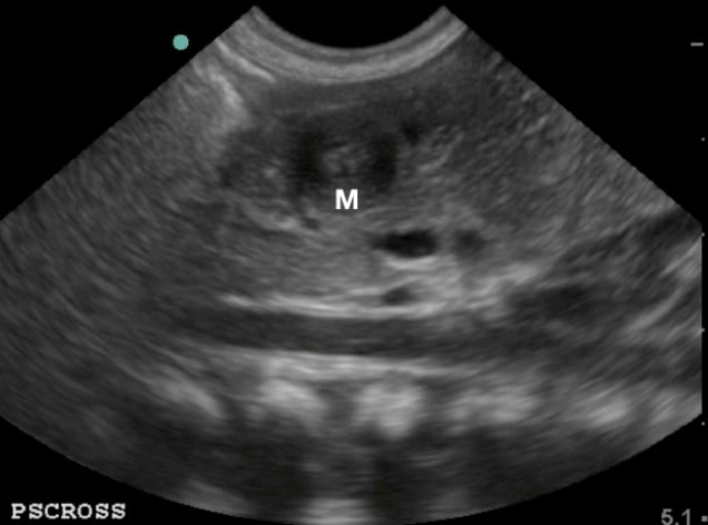 - Figure 5. Pylorus in short axis/ transverse view, the “target sign” (M: pylorus muscle)