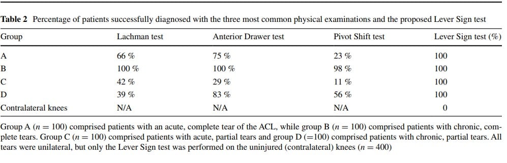 A 2014 Italian prospective study1 by Lelli et. al recruited 400 patients with confirmed ACL ruptures on MRI in order to evaluate the new ACL physical examination maneuver they created. They appropriately excluded cartilage defects, multi-ligamentous injuries, meniscal injuries, and prior reconstructions of the affected ACL. The patients were equally split into 4 groups based on two factors: 1. complete vs. partial ACL lesion and 2. acute vs. chronic. The study then blinded 1 physician (unclear if it was Dr. Lelli) to the MRI results who performed the Lever Sign, Lachman, Anterior Drawer, and Pivot Shift tests on everyone. The uninjured leg was used as a control. The results were suspiciously positive with 100% sensitivity and 100% specificity. The closest sensitivity was 72% for the Anterior Drawer. See the table below for a summary of comparative accuracies of the different tests1.