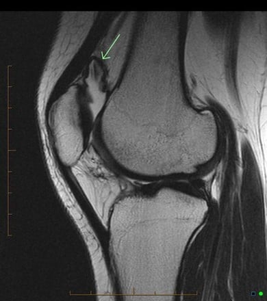 A benign embryologic remnant, this condition has a prevalence of up to 50%. It commonly presents as chronic pain with intermittent “locking” or “catching” of the joint in adolescents and athletes. It most commonly is associated with flexion-extension movements, but why some people develop significant symptoms when the prevalence is so high in the general population remains unclear. MRI, while not necessary, typically reveals the remnant. Conservative management is indicated for most patients and consists of analgesics, NSAIDs, and PT. Efficacy varies widely in the literature, with reports as low as 40% and as high as 87%. Operative management to resect the structure is indicated for individuals with recalcitrant pain.