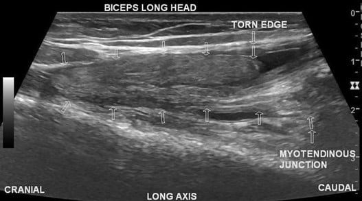 In patients with a long head biceps tear (LHBT), there may be a distinct demarcation of the distal muscle belly, known as a “Popeye” deformity (see Figure 5). On ultrasound, it appears as you move caudally towards the shoulder in the long axis, you will notice disruption of the tendon away from the glenoid with a fluid filled space (see Figure 6).