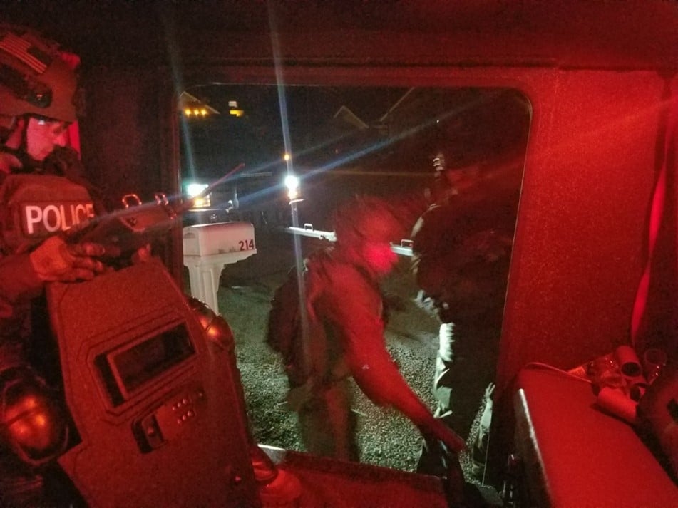 The suspect’s right elbow and part of his body can be seen in the right side of the picture. He obeyed direct orders given by a single tactical officer, who provided clear and precise commands. He slowly walked out with his hands on his head.