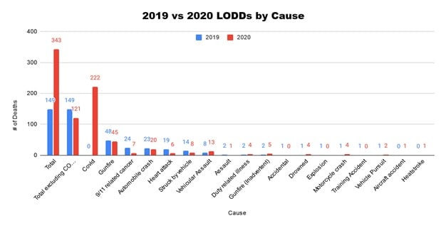 According to ODMP5, total LODD increased 130% from 2019 to 2020; however, when COVID-19 related deaths were excluded, total deaths by all other causes decreased by 19%. Non-COVID causes of LODD which decreased in 2020 include: gunfire, 9/11 related cancer, automobile crash, heart attack, struck by vehicles, assault, accidental, explosion, and training accidents totaling 58 deaths less than the previous year for those causes. In 2020, only 21% of LODD were related to felonious assault whereas in the past ten years prior, felonious assault typically accounted for about 60% of LODD8.