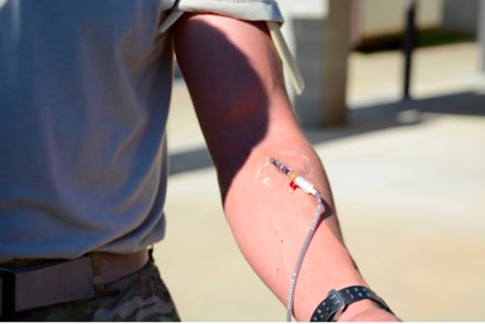 Fresh – LTOWB is much more challenging and requires identification of low titer donors prior to operational use. Similar to the military, a LEO roster and identification card is recommended (Figure 2) along with titer testing, transfusion transmitted disease (TTD) testing is completed. In the military the identified donors, need regular TTD testing prior to deployment and are valid for 90-100 days. The universal donors will carry at least one 450 ml single blood-pack unit with CPD or CPDA-1 with them in their bleeder kit. Blood collection will begin immediately following proper identification of the donor’s full name. The TEMS medic or their designated person has the option of starting a 14- or 16-gauge saline lock and then placing the collection bag needle through the needle port (Figure 3). This offers the advantage of access for replacement fluids and less positioning of the needle, though collection can be slower. Traditional blood collection uses hemostats or similar to “clamp” the collection bag line, however, the Norwegian Naval Special Operations Commando protocol has shown that step is not necessary.14 This allows blood to immediately flow into the bag when the needle is placed inside the vein and eliminates a non-essential task.
